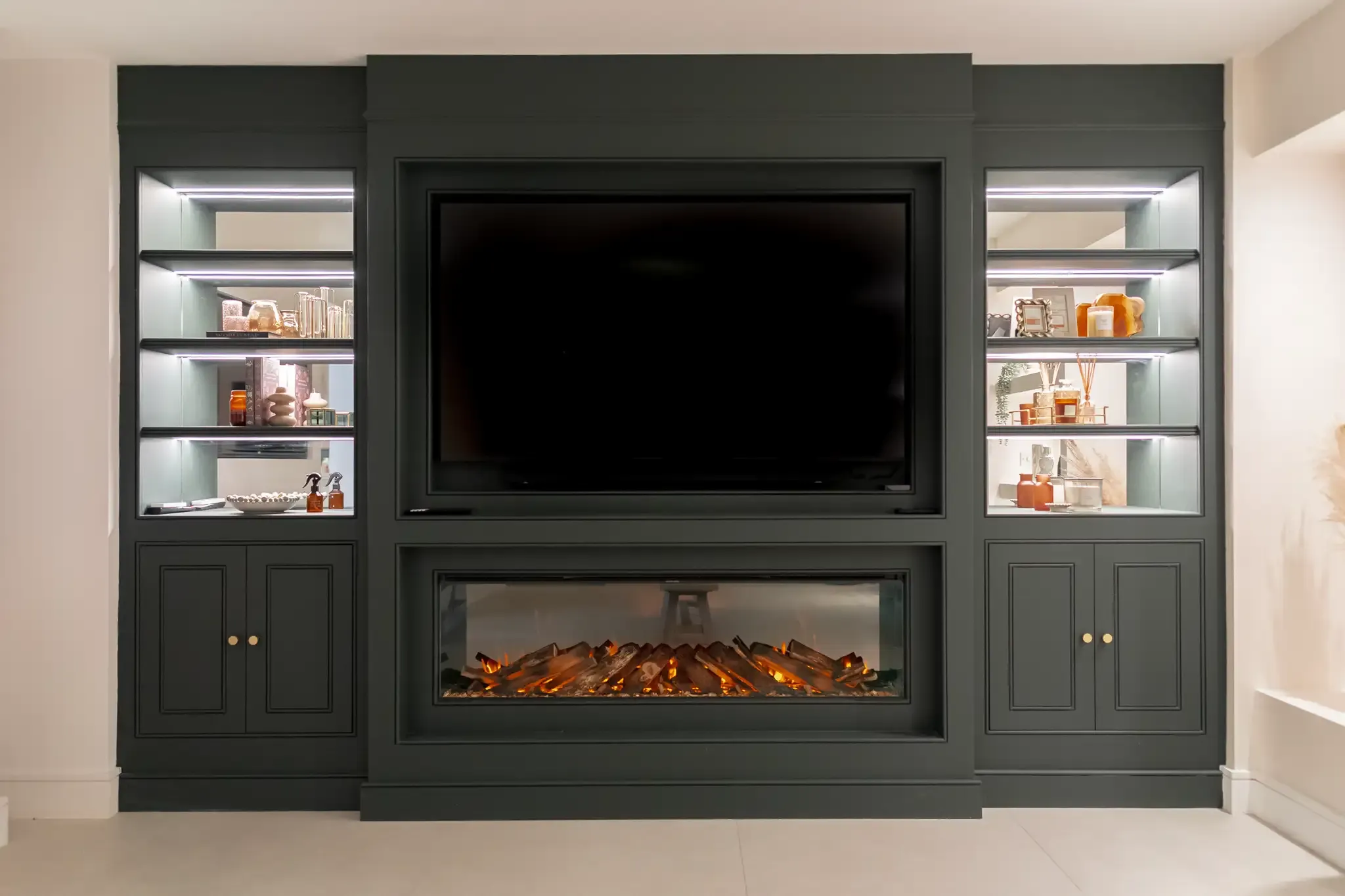 Refined, timeless and meticulously designed, The Mayfair is a classically styled media wall that brings together sophistication and function in perfect harmony. With bespoke detailing, a statement mirrored backing, subtle LED strip lighting, and a luxurious large format electric fire, it’s made to elevate your space with understated grandeur.